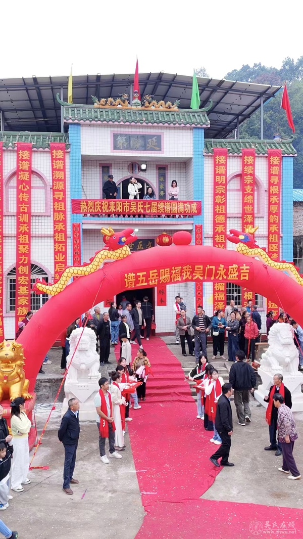 谱牒既成,族中商定农历2025年8月27日为全耒阳市吴氏统一接谱之日。消息传开,各村宗亲踊跃响应,皆以参与盛典为荣。泉塘村有幸承办太平片接谱仪式,这既是全族的信任,更是泉塘人的无上荣光。筹备期间,村里新老理事主动担当,多次召集会议商议方案;男女老少纷纷请缨,或出钱、或出力,无有推诿。有人清扫场地,让村容焕然一新;有人布置会场,红旗招展、大红气球从村头到村尾一路延展两里有余,满是喜庆;村头村尾各立有两座大红拱门,祠堂前主拱门横幅书“谱五岳赐福我吴门永盛吉”,前方墙面挂满祝颂条幅,红绸映着暖阳,字字皆含祝福;大门、立柱贴满寓意吉祥的对联,笔墨间满是对家族的期许,整个祠堂既热闹非凡,又庄重肃穆,静待盛典到来。