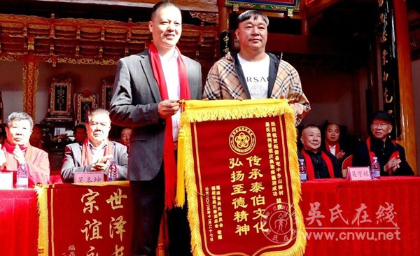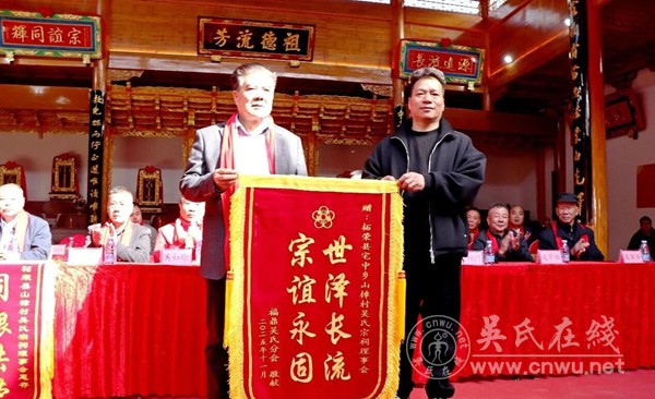 主持人宣读福建省吴氏委员会、福安市吴氏委员会的贺信。紧接由福建省吴氏委员会、福鼎市吴氏委员会、寿宁县吴文化管理委员会分别向山樟吴氏宗祠赠送祝贺锦旗。