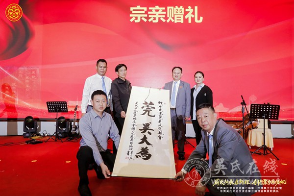 会议期间,七届世会总会主席、《吴氏名人汇集》编委会主任吴汉龙宗贤为编委会成员颁发证书,鼓励编委会人员认真负责的把编纂工作做好,远口吴氏总祠顾问、远口泰伯书院参会人员、《吴氏名人汇集》编委会主编吴邦灿与编委会成员一起代表编委会给莞吴会赠送书法一幅,并合影留念。