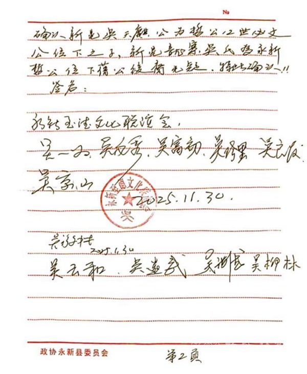 江西永新至德文化联宜会吴一为会长及当地谱牒专家对考察团提供的相关资料进行认真研究。通过察看代表团带去的老谱等资料及对双方族谱资料的对比,永新吴会确定“吴天麒公为皙公11世必文公之子,新晃龙寨吴氏为皙公位下蒨公后裔无疑”,双方吴会在《湖南省新晃县吴世万氏族赴永新县座谈纪要》上确定的结果签字盖章认可。