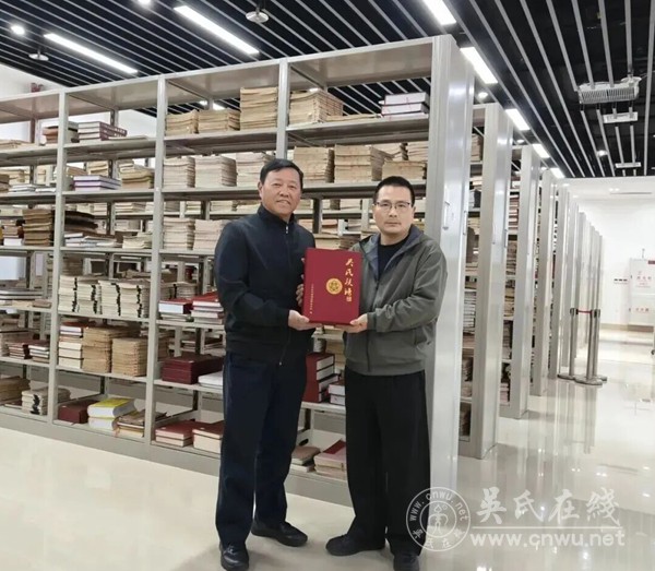 绍川主编向邱盛良主任具体介绍了《吴氏族谱》中丰富篇幅和特色内页。此次捐赠入藏的《吴氏族谱》意义非凡,其中新编修族谱耗时近二年编纂完成,汇聚各地吴氏宗亲的心血,采用传统线装压边凹形制、封面暗红烫金字体、优质双胶厚纸精印,既保留古法韵味又兼具现代查阅便利性。