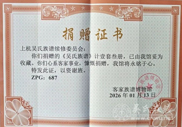 “族谱是家族的根,客家是我们的魂”。此次将族谱捐赠入藏客家族谱博物馆,既是希望这份凝聚族人智慧与情感的文献能得到专业妥善的保管,更愿以族谱为纽带,让吴氏文化融入客家文化长河,为后人寻根问祖、传承优良家风搭建桥梁,让先辈留下的精神财富惠及更多人。客家族谱博物馆负责人对上杭吴氏修谱委心系客家事业,慷慨捐赠,表示诚挚感谢,并指出,族谱是国史、方志的重要补充,更是客家文化不可或缺的组成部分。《吴氏族谱》的入藏,不仅丰富了博物馆馆藏谱牒资源,为研究客家地区宗族迁徙、民俗演变、文化融合提供了珍贵的一手资料,更彰显了客家后裔慎终追远、传承文脉的深厚情怀。博物馆将严格按照规范对族谱进行恒温保存,同步推进数字化扫描录入,纳入客家谱牒专题数据库,让这份家族记忆在新时代焕发新生,助力客家文化代代相传。