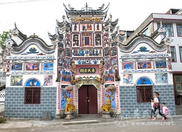 祠堂为三间两进式结构,正面牌楼彩绘技术精湛,中部略高,两侧稍低。中间为大门,大门上方青石横刻“宋氏先祠”四个大字,再上两层竖书“京兆郡”。“京兆郡”正上方则是令宋氏家族感到荣耀的唐朝宰相宋瑾及清翰林院庶吉士宋仁溥的塑像,右边人物塑像为北宋文学家宋祁,左边人物塑像为战国辞赋名家宋玉。从这些人物塑像的选择中我们感觉到,骄傲与宗族情感是与生俱来的。为了在乡间炫耀自己的高贵出身,强化族人对自身的体认,以凝聚人心,激励后来。所以,被搬出来的极尽张扬的老祖宗总是明君圣主、忠臣良将、英才人杰。