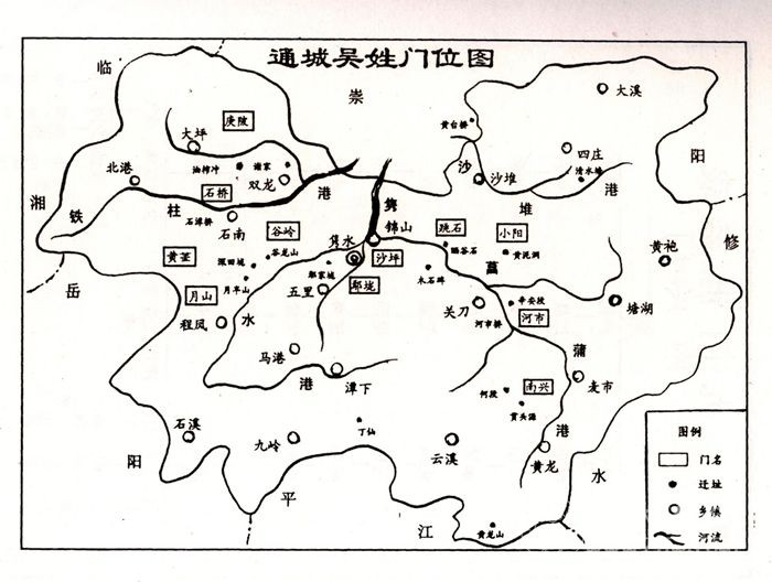 吴姓迁通后,人丁蕃衍,到十五世时分为一支一门,依据始迁落业的居地取门名,共分十三门。四世汉璞的十代孙念九为小阳门,福一为河市门,凤为跳石门,三三为蒲圻门,六六为庚陂门,六九为沙坪门,万二为清水塘门,七十为黄篁门,九五为谷岭门,七五为月山门,宗胜为石桥门,以上十一门上溯尊汉璞为门公祖。汉璞之弟汉琳十代孙仕重为南兴门,冈为鄢垅门,上溯尊汉琳为门公祖。