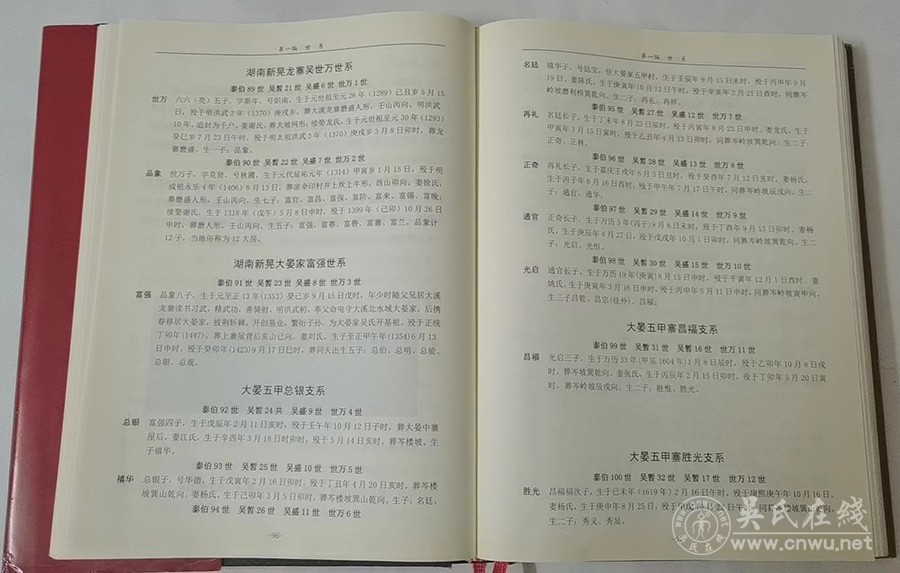2、万家塘再帑支系:再正通光昌盛秀,嘉守德国大志成。吴宝矩1934年合族统派时续四十二字:三让祖传永作则,敬修学懋定增荣,积善庆长先本孝,振兴宏达啟文明,天佑人福兆祥瑞,凤仪代有济世英。共五十六字。