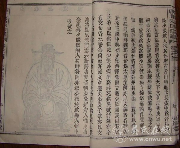 注:吴少微(663-750),字仲材,号遂谷,唐代著名文学家,泰伯61世孙,吴义方次子,随父由豫章迁歙州,自幼聪颖好学,以经术登武则天长安三年(703)进士,初授晋阳尉,后官至左台监察御史。少微文辞儒雅雄迈,与富嘉谟合称“吴富体”,与富嘉谟、谷倚誉为“北京三杰”。《崇福寺钟铭》尤为时人所推重,《全唐文》录其文六篇,《全唐诗》录其诗六首。非常重视族史研究,曾主修《吴氏正宗谱》撰谱序,逝后葬休宁凤凰山。休宁吴氏因少微而显赫,左台吴氏奉少微为始祖最为兴盛,世居新安左台苗裔有70余支,人口数以万计,总支分为莲塘、金竺、石岭、城门、丰溪等五大派。吴少微娶武阳公李大亮之女,生三子:隆术、巩、筠(一作云)。吴筠(字文彬)曾任河东节度使,后裔迁居四川。吴巩(字定国)官至中书舍人,文如其父,子孙备极蕃盛,分迁金陵、德兴、池阳等十多处,豸岭吴也是吴巩之后。