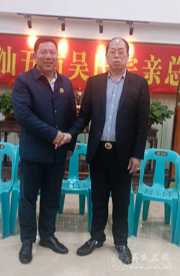 大潮汕吴氏宗亲总会会长吴汉龙携大家已在总会门口恭候我们的到来!天色临晚,双方短暂的握手互相问候之后很快抓紧时间座谈交流。大潮汕吴氏宗亲总会会长吴汉龙首先致欢迎词,他说,吴氏一家亲,你们今天是回家来了,热烈欢迎琼海宗亲回到大潮汕家!大家霎时掌声响起来,我们琼海宗亲一行感动万分,温暖满怀,幸福满怀!他随后接着向我们介绍大潮汕吴氏宗亲总会的工作情况及吴文化建设发展蓝图。琼海市吴贤秀研究会会长、琼海泰伯书院(筹)院长吴平代表大家,挚诚感谢感恩大潮汕吴氏宗亲总会的热情邀请和款待,衷心感谢感恩大潮汕吴氏宗亲总会会长吴汉龙的热情邀请和款待,他随后接着向大潮汕吴氏宗亲总会并吴汉龙会长汇报介绍琼海吴氏宗亲工作和泰伯书院(筹)建设发展情况。吴平会长(院长)最后衷心感谢大潮汕五市二百多万广大吴氏宗亲,向大潮汕吴氏宗亲总会学习致敬!向大潮汕全体吴氏宗亲学习致敬!