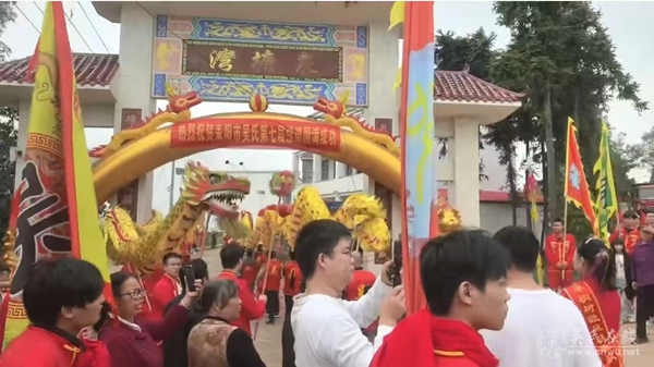 十时四十八分,一面面绣着“吴”字的大旗在晨光中展开,猎猎迎风,引领着迎谱队伍缓缓驶入视野,全场瞬间沸腾!千百人组成的游行长龙,如一条红色的血脉,自太平圩向泉塘村蜿蜒而行:十余条彩龙昂首摆尾,鳞爪飞扬间似有吞云吐雾之势,引得路人驻足喝彩;威风锣鼓队鼓点铿锵,每一声都震彻寰宇,唤醒宗亲血脉中沉睡的豪情;西洋乐队奏响明快乐章,与传统鼓乐交相辉映,谱出一曲古今交融的欢歌。沿途彩旗如潮、红绸似浪,秧歌队队员手持彩扇翻飞,舞步轻盈间跳出心中的喜悦;龙狮队腾跃扑闪,狮身舞动时尽显祥瑞之兆。各村宗亲特意拉来鞭炮、礼炮,炮声穿云裂石,响彻云霄;泉塘村全湾老幼早已在村口牌坊下恭迎,舞龙队龙头三叩,以最隆重的礼敬,迎接各村宗亲的到来。行至泉塘村祠堂广场,万响鞭炮齐鸣,礼炮冲天而起,烟雾缭绕间,似有先祖英灵俯瞰人间,见证这延续千年的宗族盛事。