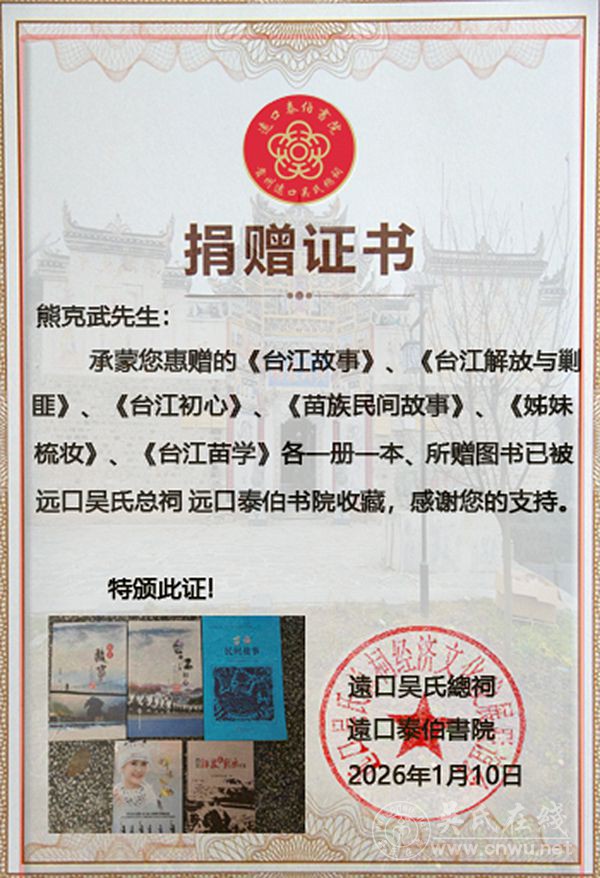 2026年元月10日下午,远口吴氏总祠吴世平会长收到台江县文联原主席、现任台江苗学会副会长態克武先生邮寄捐赠给远口吴氏总祠和远口泰伯书院书刊,有《台江故事》,《台江解放与剿匪》,《台江初心》,《苗族民间故事》,《姊妹梳妆》等书刊。